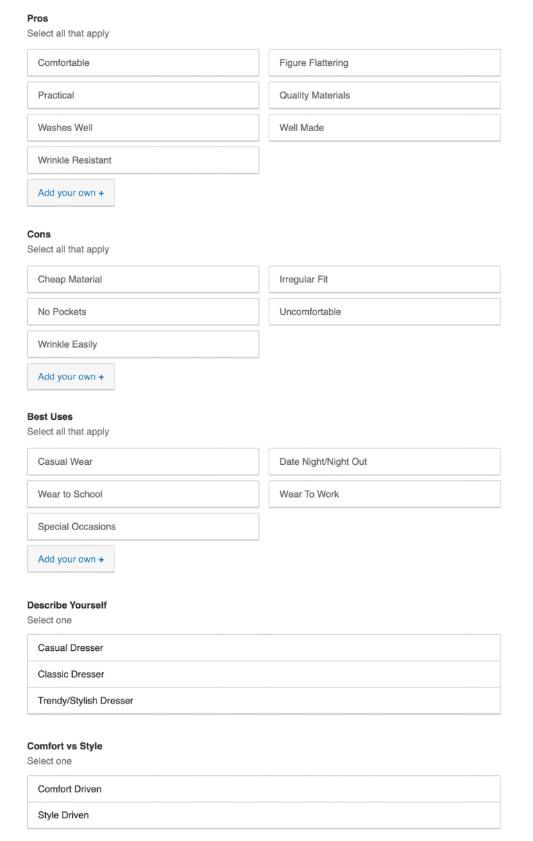 A skincare company might opt to include questions about the reviewer’s skin type and skin concerns. That way, they can add a feature to their display allowing shoppers to easily find content written by others with similar skin types and concerns.