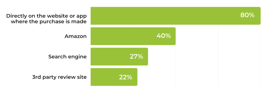 80% want to find reviews directly on the website or app they’re purchasing from. And 40% seek reviews for grocery products on Amazon. Other preferred spots for finding reviews are search engines (27%) and third party reviewers or review sites (22%).