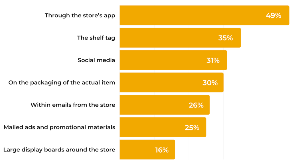 The most popular answer is through the store or grocery provider’s app, with 49% of in-store grocery shoppers indicating this is where they want to find ratings and reviews. But plenty of shoppers want to see reviews on in-store signage, as well as through other print and digital marketing channels.