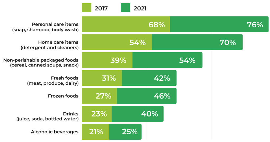 It’s also interesting to note that the percentage of shoppers purchasing every single category has increased since 2017.