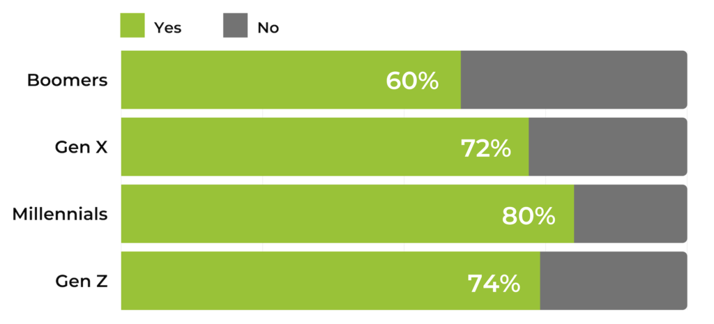 It’s interesting to note that younger generations are more likely to shop for groceries online. 80% of Millennials and 74% of Gen Z shoppers had purchased groceries online in the most recent three months of being surveyed, compared to 60% of Baby Boomers and 72% of Gen X.