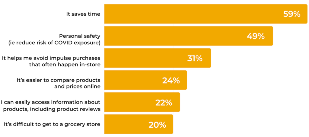- Top reasons include time savings (59%), personal safety (49%) and avoiding impulse purchases (31%).