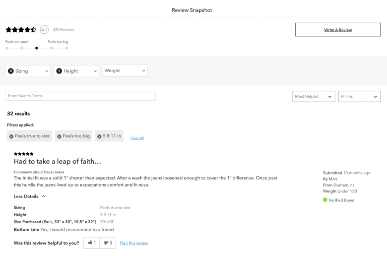 Some brands and retailers also ask reviewers to include details such as height and body type. Shoppers can then filter reviews to find feedback written by those with similar characteristics to them. For example, on this brand’s site, visitors can filter to see reviews written by those of specific heights and weights.