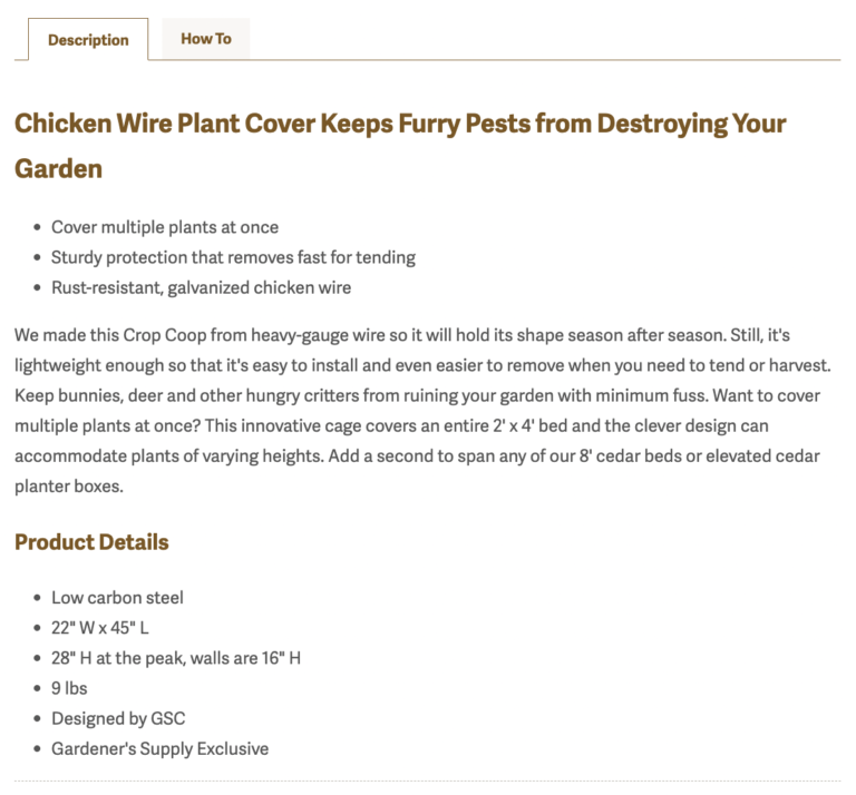 This is another home and garden PDP that also uses bullet points to convey the key features of the product. The brand also uses graphic icons to chunk the text into easier-to-read sections.