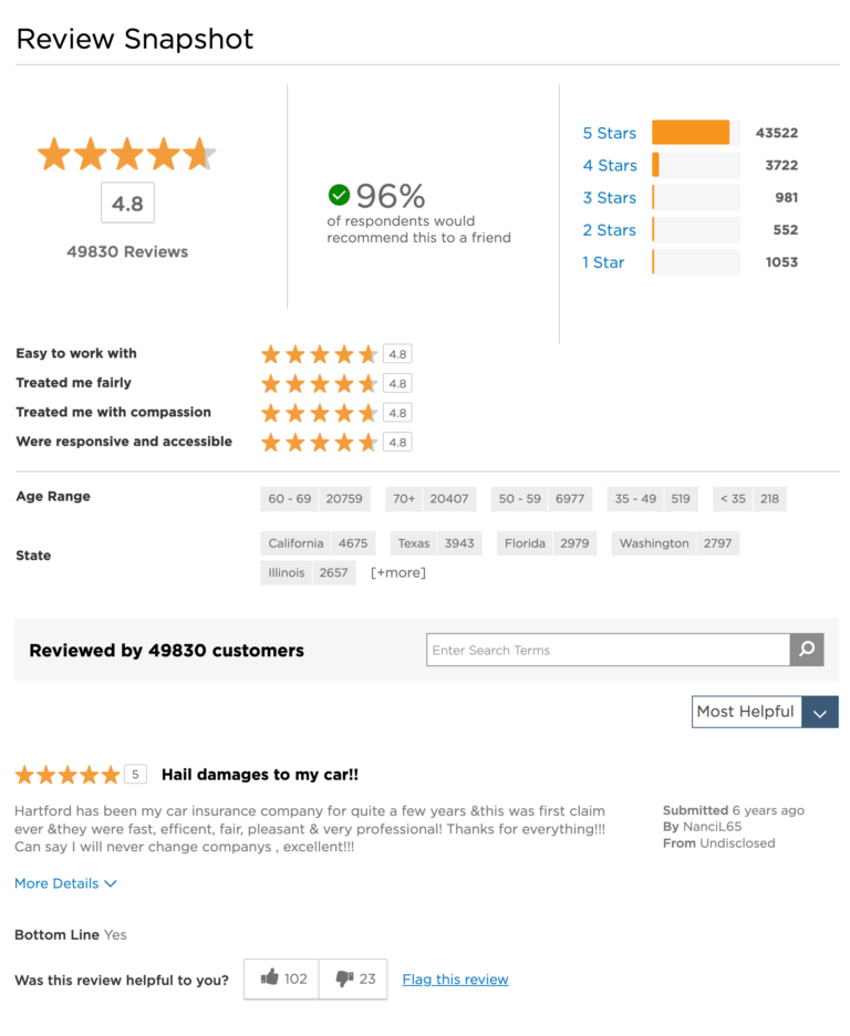 This review snapshot for a financial services brand includes many of the features of the other examples we shared. One unique thing about this display is that the brand asks reviewers to include their age range and state. Then, in the snapshot, they indicate the number of reviews available for each age range and state option. Shoppers can click on a specific state or age range to see content that matches these criteria.