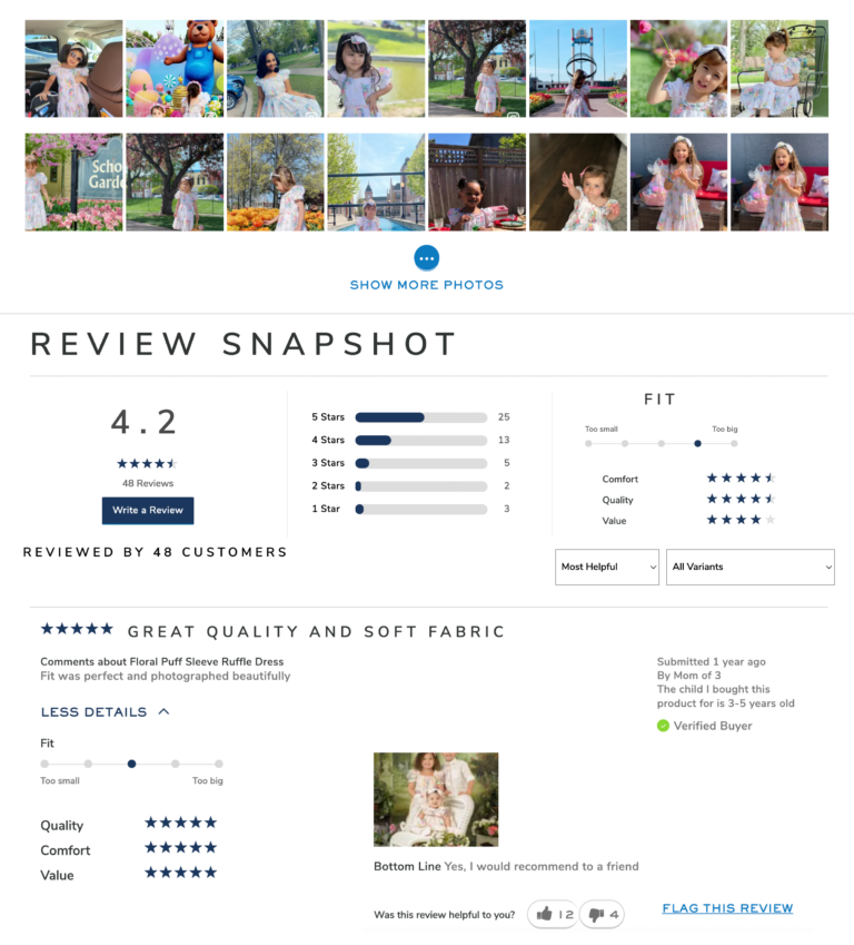 Some brands – including children’s clothing brand Janie and Jack – ask reviewers to include information in their review about how the product fits upon arrival. Then, the brand aggregates this data and includes a size and fit summary in the review display. Based on the reviews for this product, we can see that this item typically is found to be slightly large.