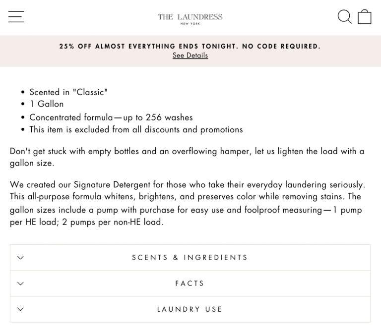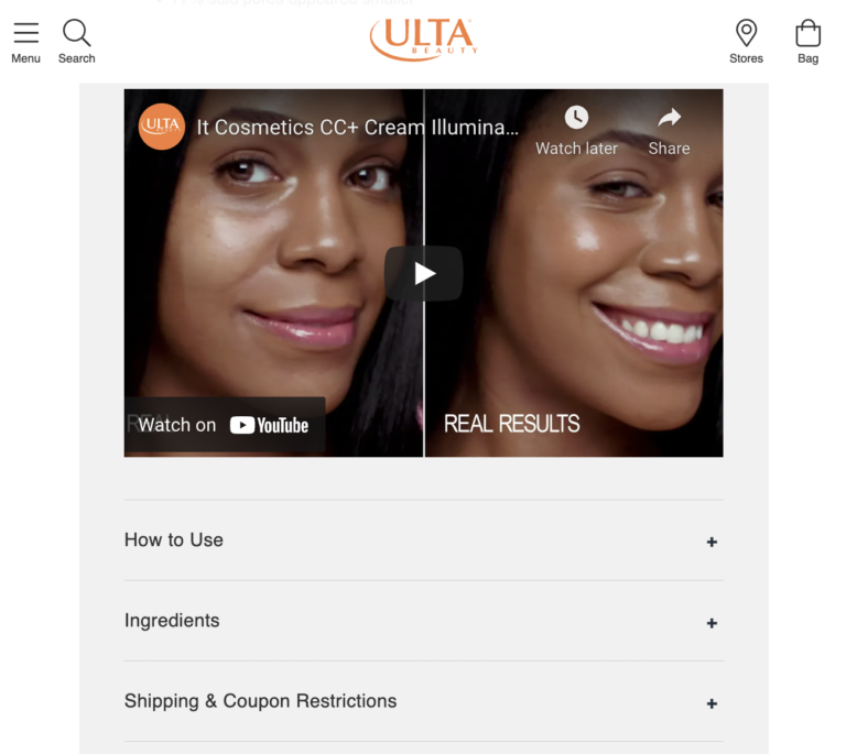 Some brands and retailers break up the product description into multiple sections so shoppers can hone in on the details that matter most to them. For example, this brand has multiple tabs on its PDPs, including a description, information about use, and ingredients.