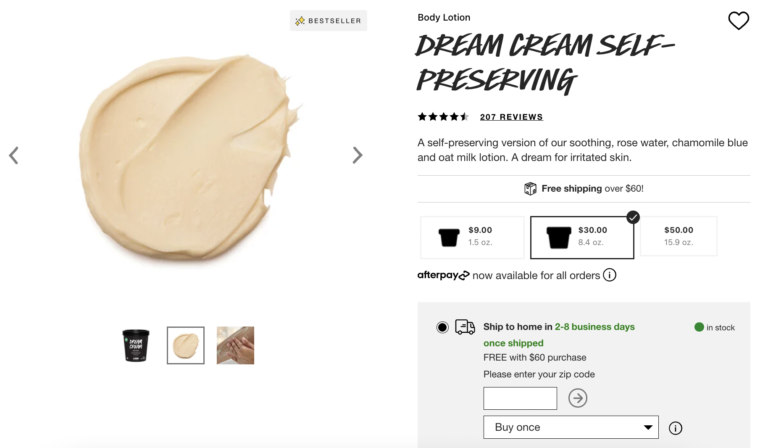This product page for a beauty product is a great example. The brand-provided imagery includes not only a photo of the lotion in its packaging, but also a couple images of the product itself to help shoppers understand consistency.