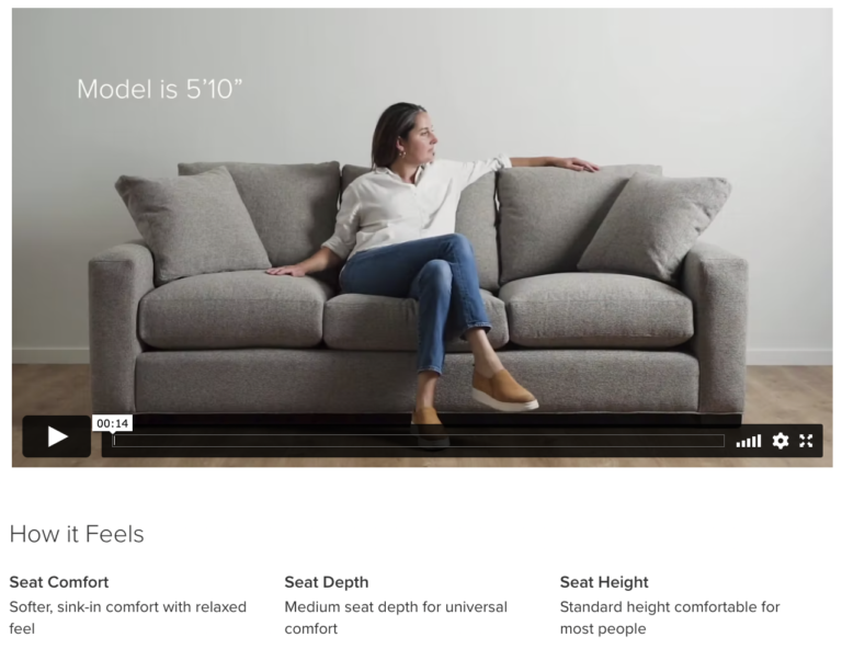 As another example, this home brand includes a video of a couch with a person (along with their height measurements) on it to help shoppers understand scale.