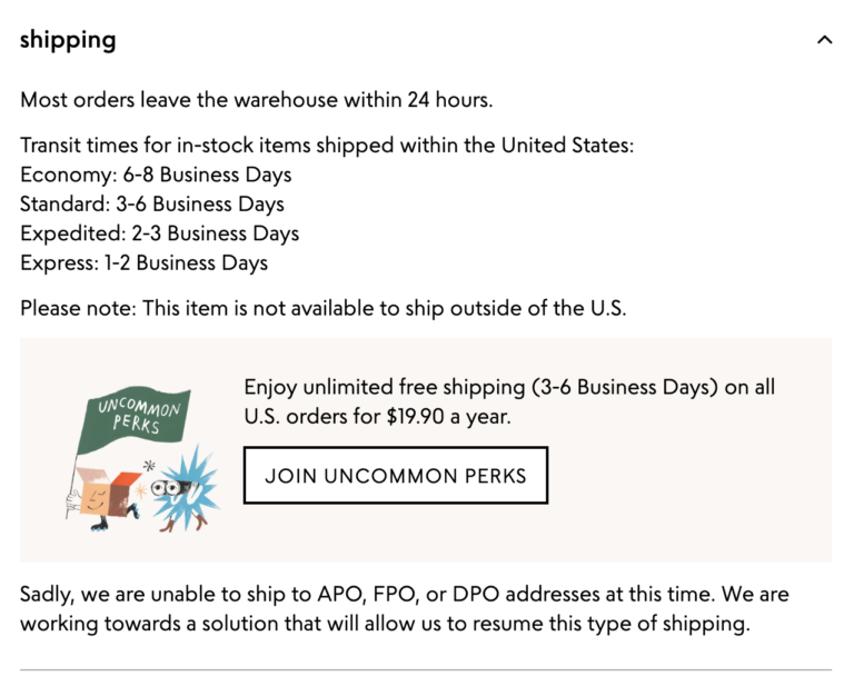 This specialty retailer includes an entire section on product pages devoted to shipping information. This section lets shoppers know how quickly items leave the warehouse and how long transit time is, based on the selected shipping method. They also include a list of addresses they’re not able to ship to, which can eliminate frustration during the checkout process.