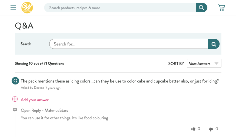 In this Q&A display, visitors can sort existing questions by factors including recency and number of answers. Shoppers can also easily search for questions that include certain keywords or phrases.