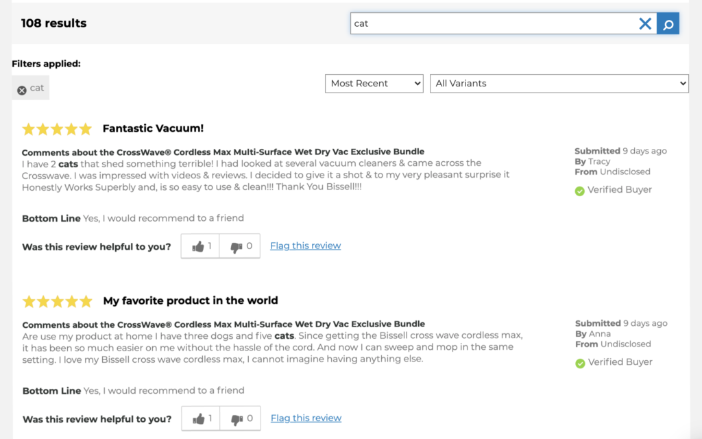 It’s great news that so many shoppers use and value review search. After all, our previous analysis of 1.5MM online product pages from more than 1,200 brand and retailer sites found that shoppers who use the search feature on a product page convert at a rate that’s 202.9% higher than average.