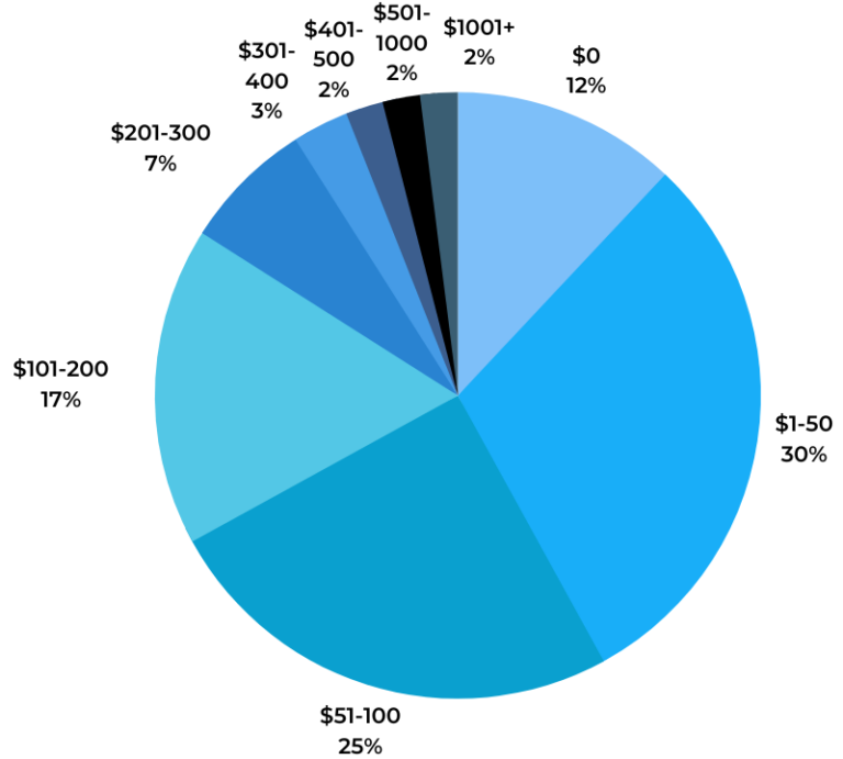The graph below provides an overview of how much consumers are spending online on footwear each month. The largest portion (30%) spend less than $50 online on shoes each month. A quarter spend between $51 and $100.