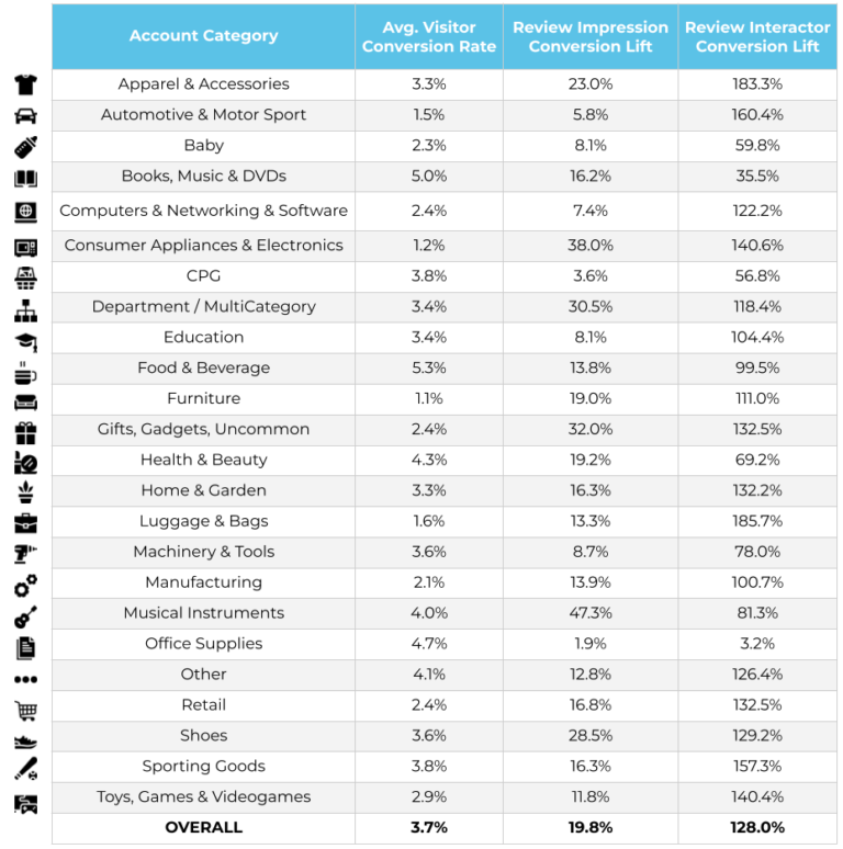 Given the high conversion impact of ratings and reviews, we sought out to analyze the conversion impact across different verticals. In our analysis, we looked at both the conversion lift by visitor (those who saw review content on the product page they visited) and review interactor (those who interacted with review content on the page they visited). We’ve also shared the average conversion rate for each vertical as a baseline.