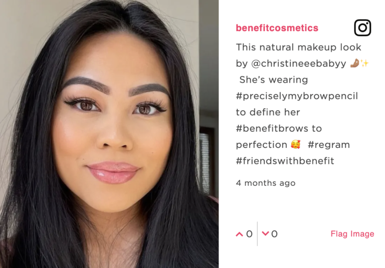 Benefit Cosmetics curates photos from their own social feed featuring real customers. They include the precise shade and product used in each image, enabling shoppers to see how the different shades look on different people.