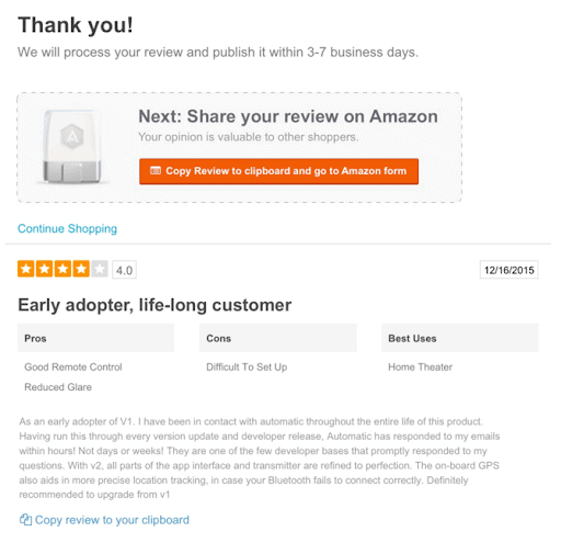 At PowerReviews, we enable shoppers to also publish reviews they submit to your site to Amazon. After customers finish writing a review for your website, all they have to do is click this button. They’re taken directly to the corresponding product page on Amazon.com, where they can paste and submit their review.