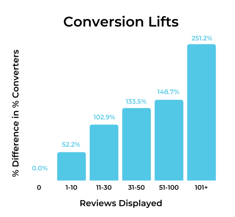 Our data shows that there’s a direct, linear relationship between the number of reviews a shopper is exposed to on a product page and the lift in conversion rate. When just one review is added to a product page, the product’s conversion rate lifts by 52.2%. Add ten more reviews, and it increases by 102.9%!