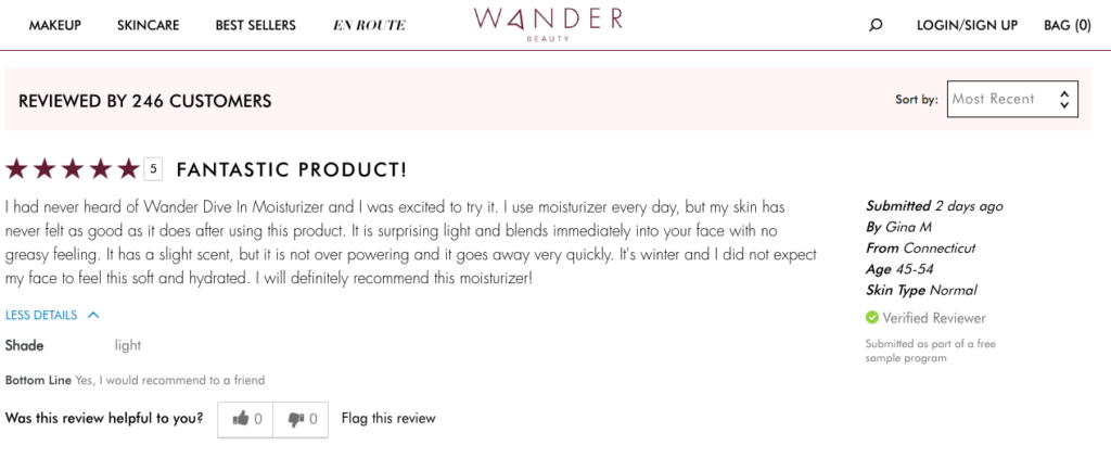 For example, it’s clear that the person who wrote this review for Wander Beauty is a verified buyer who received a free sample in exchange for their review.