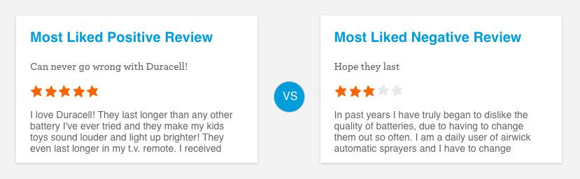 The Review Faceoff showcases the most liked positive and negative review for a specific product.