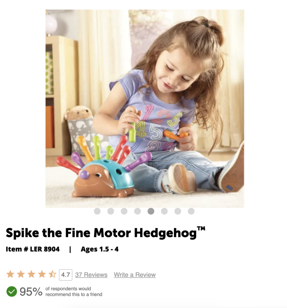 One example of a brand reaping the rewards of the Review Faceoff is Learning Resources. On its Review Snapshot on the Spike the Fine Motor Hedgehog, shoppers can clearly see the pros and cons of the product as cited by reviewers and view the Most Liked Positive Review and the Most Liked Negative Review.