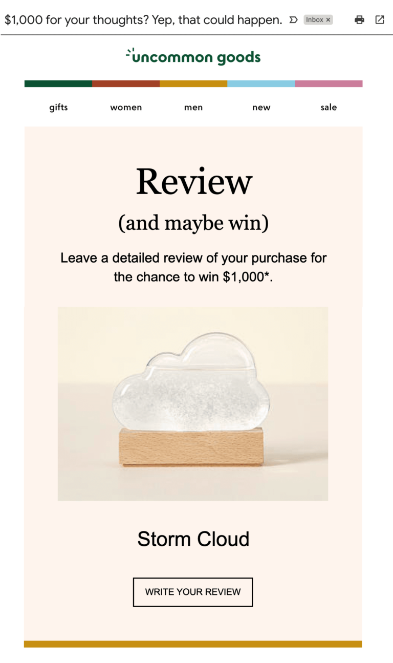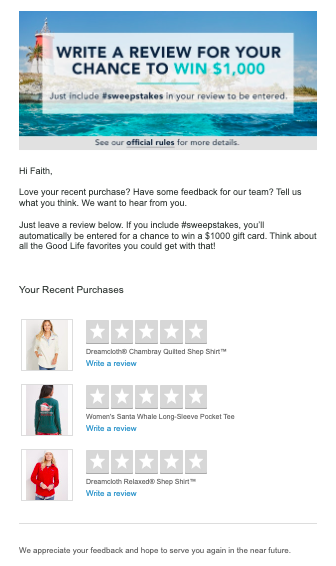 While most consumers are willing to write reviews, many won’t do so of their own accord. Instead, they need to be asked. The most effective way to do so is to send a post purchase email asking that the shopper submit reviews for recently purchased products.