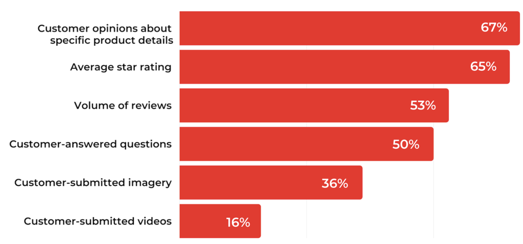 What elements of reviews and other types of user-generated content do grocery shoppers find most useful when making purchase decisions? 67% of shoppers say it’s useful to read other customers’ opinions on specific details relevant to a product. A product’s average star rating is valuable information to 65% of shoppers, and the volume of reviews matters for 53%.