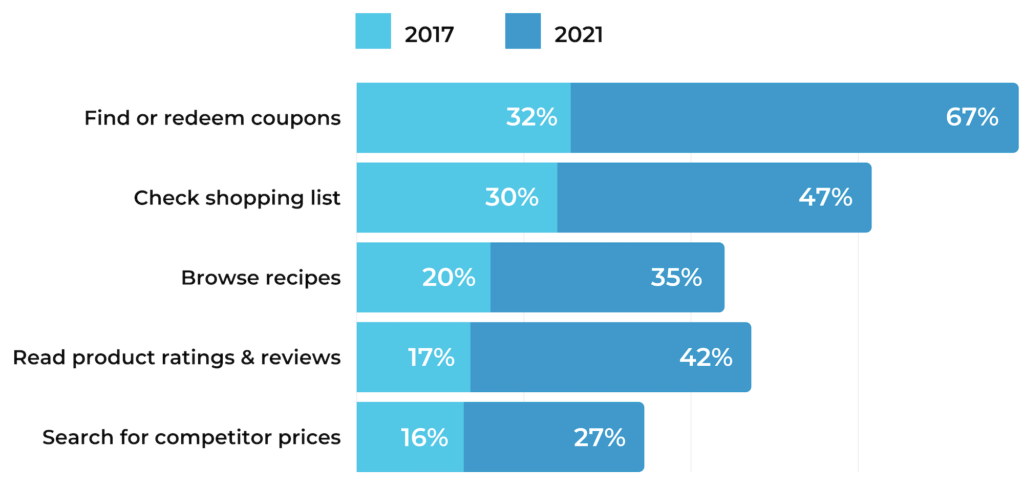 The most popular activities in-store grocery shoppers are using their phones for are finding or redeeming coupons (67%), reviewing shopping lists (47%) and reading product ratings and reviews (42%). It’s worth noting that in-store shoppers are doing all of these activities much more frequently than they were in 2017.