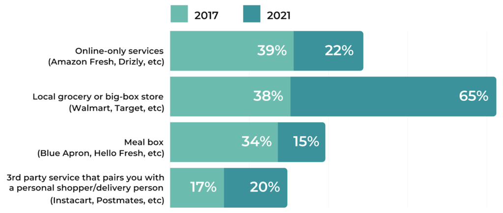 When asked where they’d purchased grocery items online from, more than half (65%) said they’d ordered pickup or delivery from a traditional grocery or big-box store. In comparison, only 38% chose this option when we surveyed consumers in 2017.