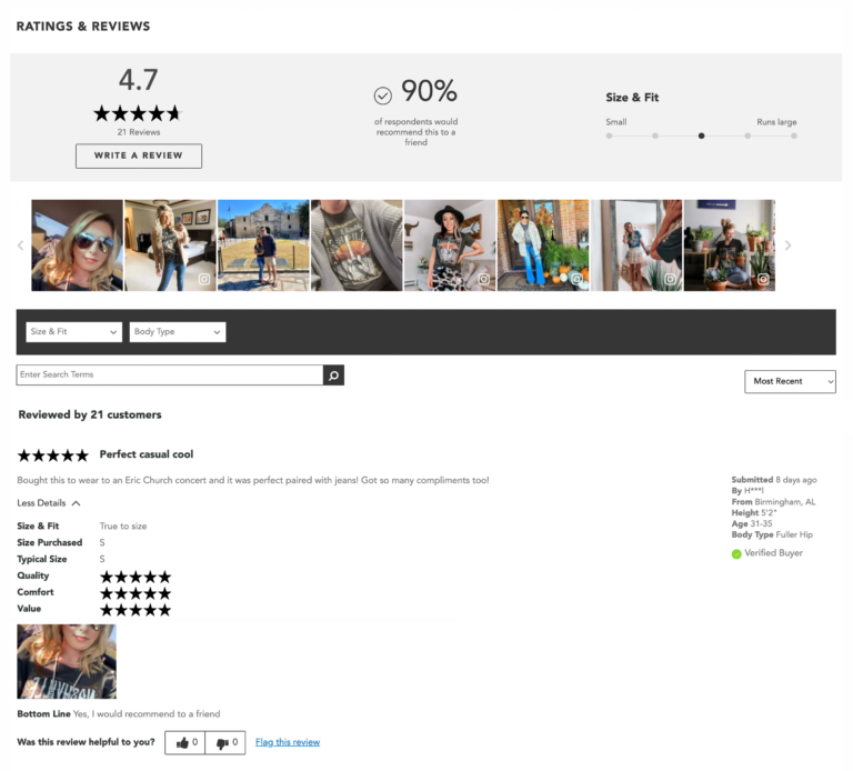 User-generated content including reviews and imagery (both of which we’ll explore in more detail later on) can help shoppers understand size and sizing sight unseen – and choose the products that are the best size and fit.