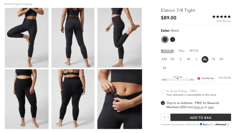 Imagery on apparel PDPs can help shoppers get a better idea of the details of the product – for example, pockets and seams. And, as we covered earlier, if a brand or retailer showcases multiple models on their apparel PDPs, it allows shoppers to get a better idea of what an item of clothing looks like on different body types.