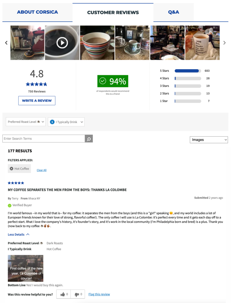 On this review display, the shopper can sort reviews by a number of different factors, including star rating, recency and the availability of imagery. They can also do a search for content that includes a specific word or phrase.