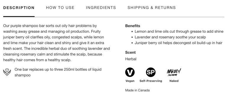 Some brands and retailers break up the product description into multiple sections so shoppers can hone in on the details that matter most to them. For example, this brand has multiple tabs on its PDPs, including a description, information about use, and ingredients.
