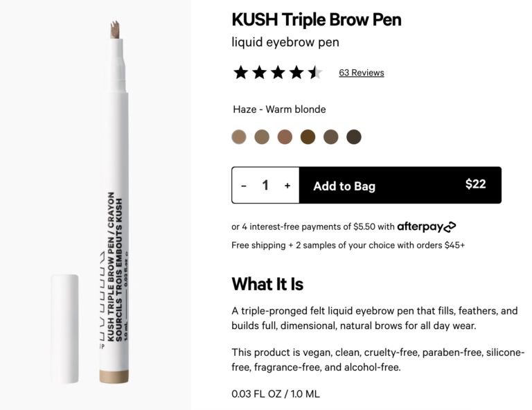 For example, shoppers considering this brow pen can easily see that the item is $22 – and that unless they spend over $45, they’ll have to pay for shipping too. Shoppers can also see that it’s an option to pay for this product in installments.