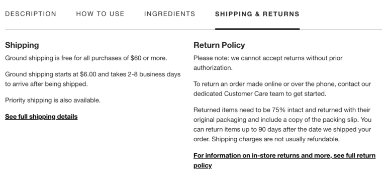 This product page on a beauty brand’s website is another great example of clear shipping and returns information. Visitors can input their zip code and get an exact date of when they can expect the product to arrive.