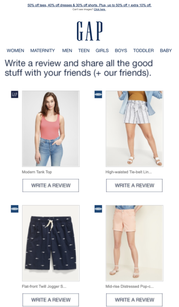 Today, nearly all shoppers consult reviews when shopping online, and over half (57%) do so when they’re shopping in brick-and-mortar stores. Make collecting reviews from your customers a priority. The most effective way to do this is to send emails to your customers post-purchase, asking them to write reviews for the products they bought.