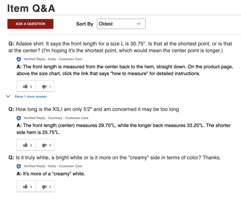 Consumers shopping for clothing in a brick-and-mortar store can ask questions of a store associate. Online shoppers don’t have this luxury. But many leverage the questions and answers (Q&A) portion of product pages to get answers to their purchase-blocking questions.