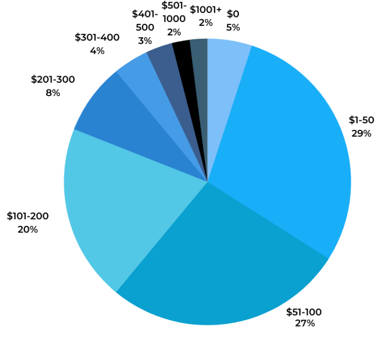 The graph below provides an overview of how much consumers are spending online on footwear each month. The largest portion (30%) spend less than $50 online on shoes each month. A quarter spend between $51 and $100.