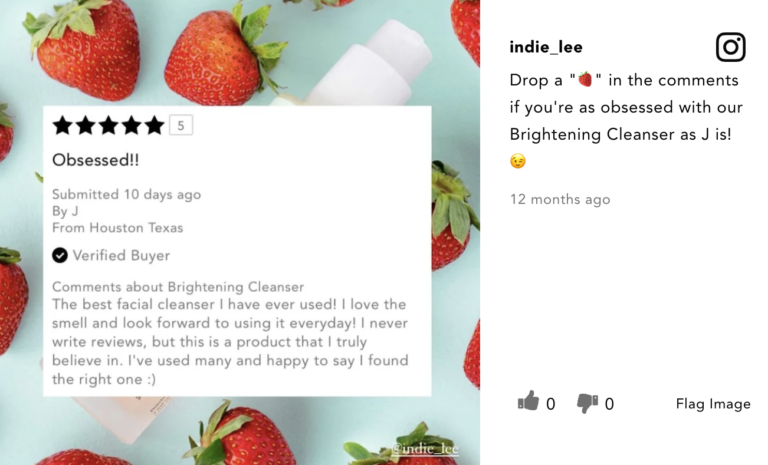 You can reuse these images in marketing materials across your website and email. You can even get really meta and showcase reviews in your social media, only to curate those same images right back on your product page, like Indie Lee does. It’s like the movie Inception for UGC!