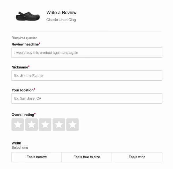 The basic review form asks shoppers to provide an overall star rating and describe their thoughts. That works fine for some brands, but footwear shoppers have much more to consider.