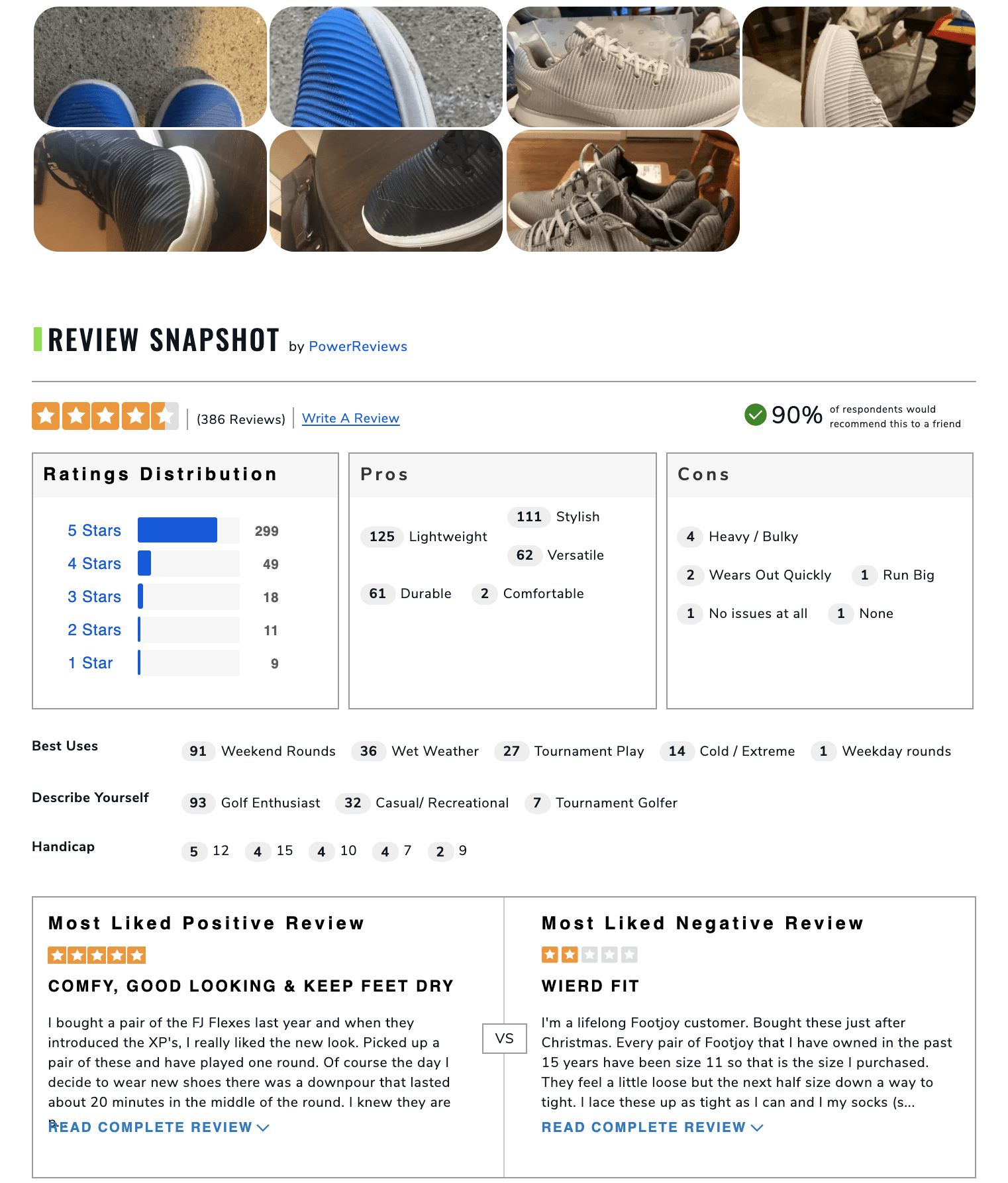 Now, the specific order in which these appear, or even the content (in the case of demographic information, for example) may vary from brand to brand. Here are a few review snapshots that show how brands from different verticals implement their review display: