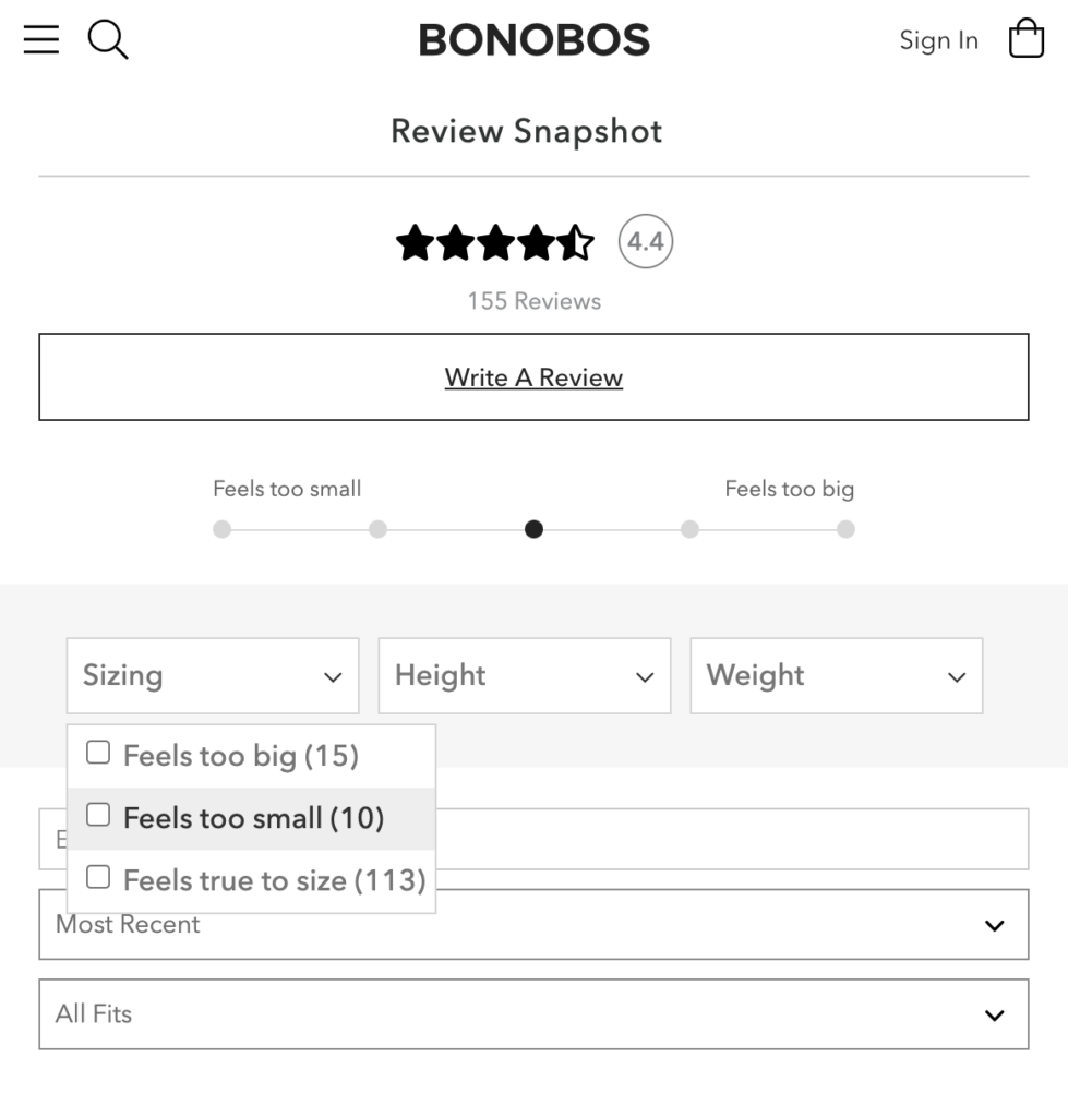 Consumers who interact with review content drive a 115% increase in visitor conversion rate per our research. The Size/Fit Snippet is a great way to facilitate this interaction. Why? It gives shoppers the ability to filter reviews to bring the most relevant review content front and center.