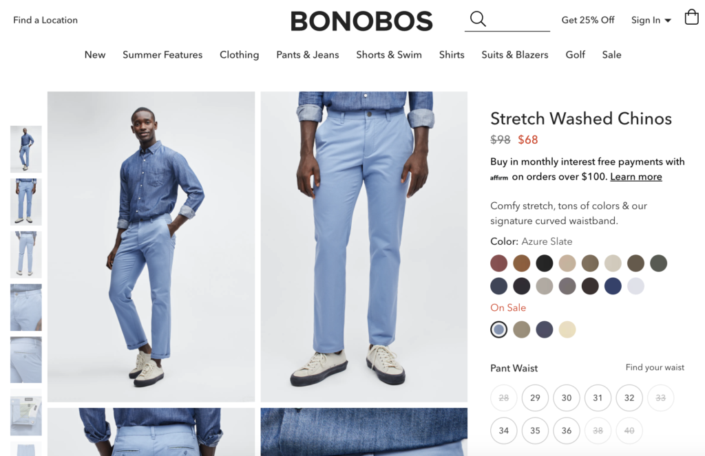 To see a great use of the Size/Fit Snippet in action, check out Bonobos. The men’s clothing designer and retailer’s claim to fame is that it offers “the most fits in pants – Skinny, Tailored, Slim, Standard, & Athletic – across sizes 28-54 so you’re bound to find the right fit.” To support this value proposition, the company offers copious size and fit information resources on its website.