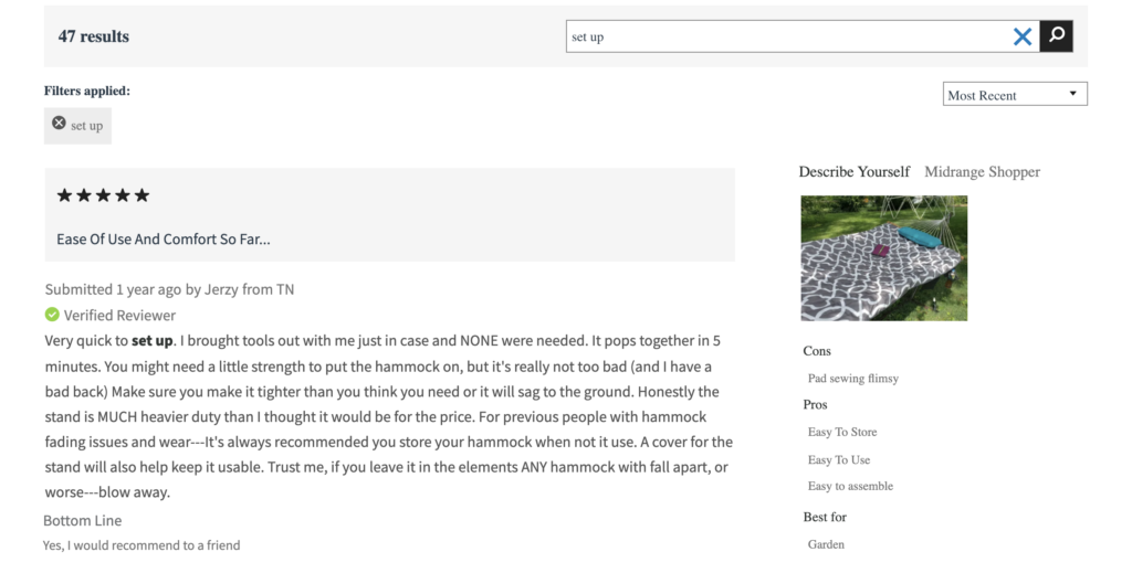 The Sort and Filter/Search Bar on home furnishing retailer Hayneedle’s product display page for its Algoma 11-ft. Cotton Rope Hammock with Metal Stand Deluxe Set, is a solid example. It’s also clearly a very helpful feature given the product has over 225 reviews!