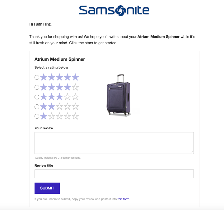 It’s important to give the shopper enough time to try out the product multiple times before asking for a review. After all, 86% say they’re more likely to submit a rating and review if they’ve used the product more than once.