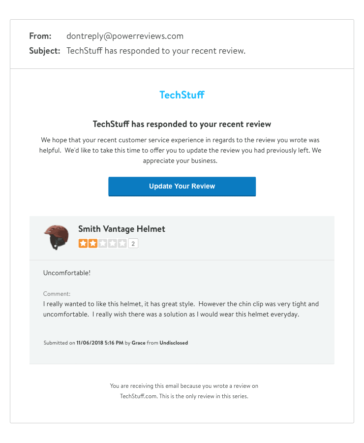 Brands I’ve personally worked with have experienced exceptional results when implementing this capability — in fact, one generated a 54% increase in reviews displaying on site in the first 30 days of it being in use. Quite a shot in the arm for the entire program.