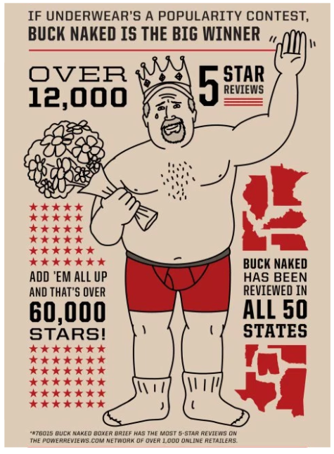 Consumers trust the opinions of others like them. So look for ways to integrate user-generated content — including reviews, photos and videos — into other print and digital marketing initiatives, such as email, social and display campaigns. For example, our friends at Duluth Trading Company tout the number of 5-star reviews they have for their Buck Naked underwear in a number of different marketing initiatives across channels.