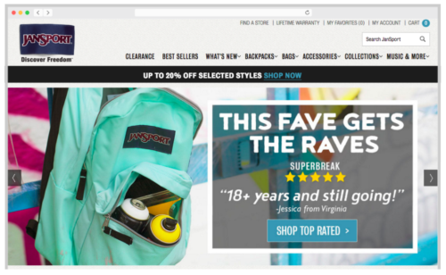 Want to influence where a visitor goes once they hit your homepage? Include star ratings and reviews for a featured product on your homepage. For example, our friends at JanSport highlighted their best selling “Superbreak” backpack on their homepage (just in time for back to school shopping), along with the average star rating and a written review for the product.